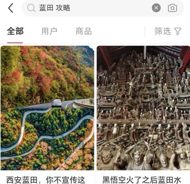 而在小红书中,第一屏4条笔记,除了给出蓝田6个值得一玩的景点,还分别介绍了蓝田水陆庵近日的人流情况、荞麦岭的错峰时段。